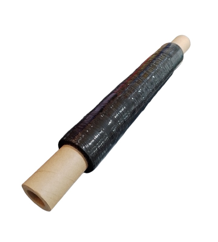 FILM STRETCH NEGRO CON MANIJAS PARA USO MANUAL EN EMBALAJE.